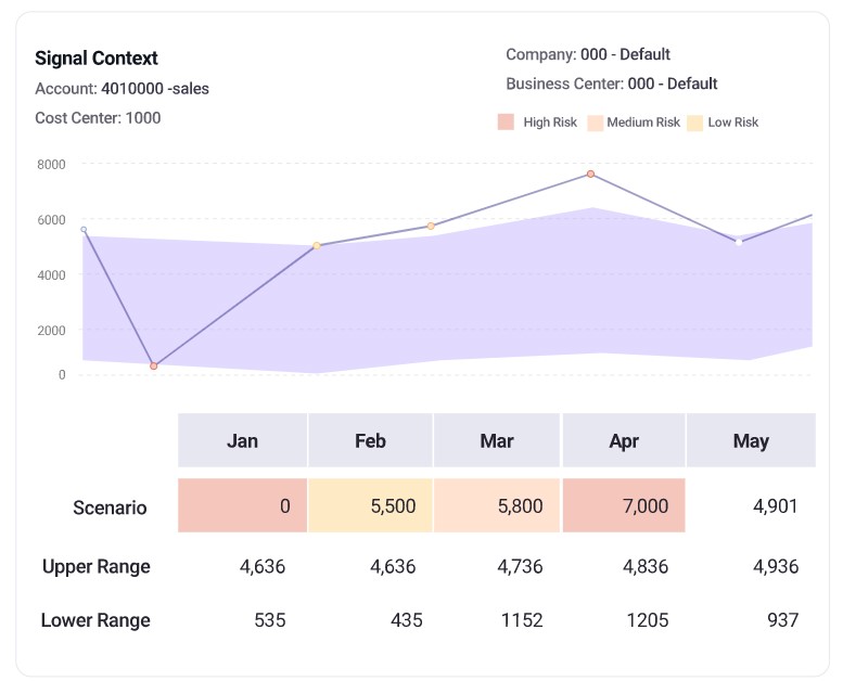 Predict: Signals highlights forecast values that are at low-, medium- or high-risk of not being realized, supporting variance analysis, replanning and proactive action.
