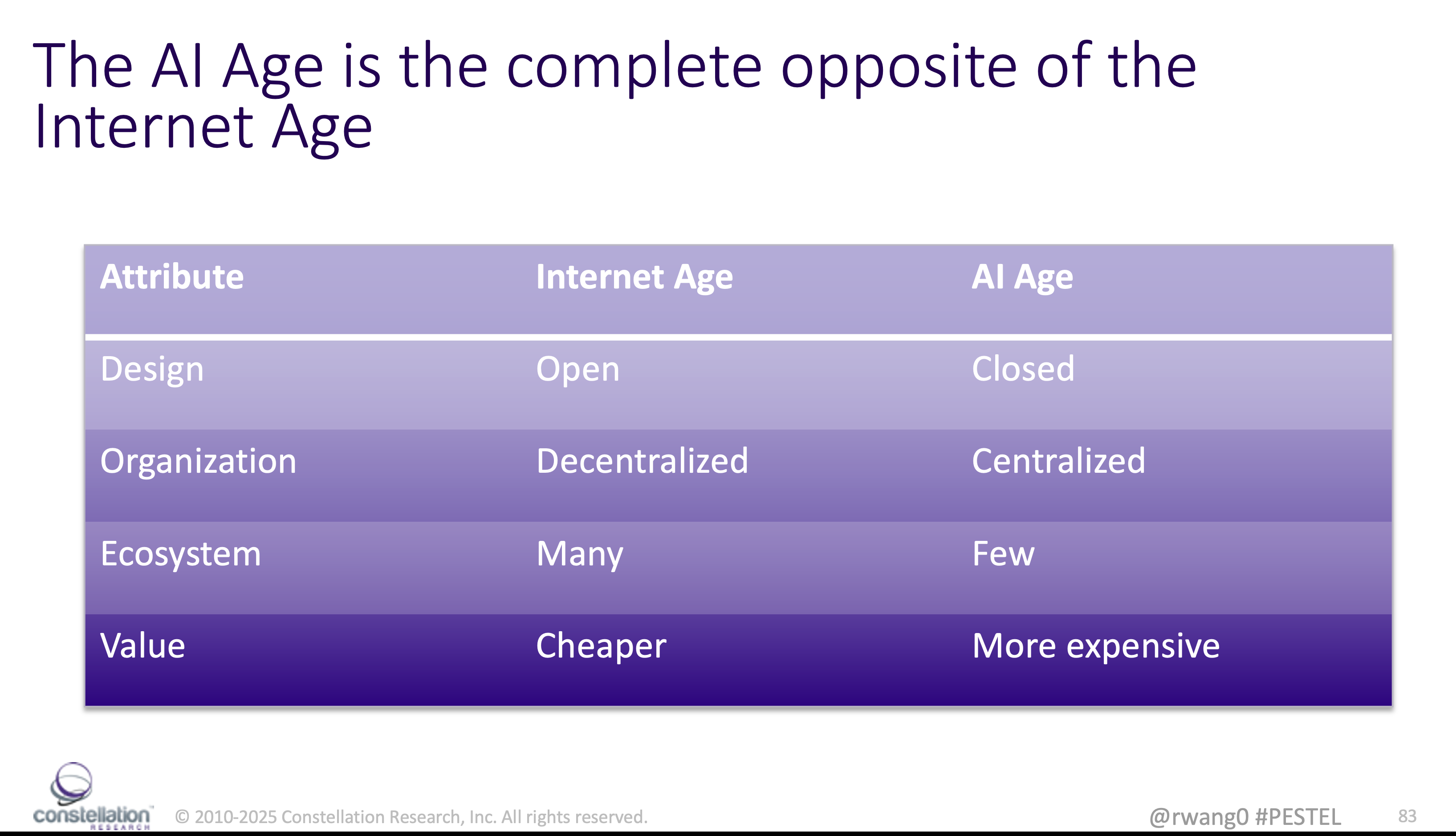 Today, the AI systems are highly centralized, closed, with fewer players, and much higher costs. In fact, the barriers of entry to AI will create an AI divide bigger than the current digital divide. Many countries will not be able to afford the compute power, the energy, and the human power required to effectively manage AI. And even worse, the world is abuzz about AI, yet the costs of AI continue to go up, not down. Constellation Research expects an AI divide worse than than todayâs digital divide.