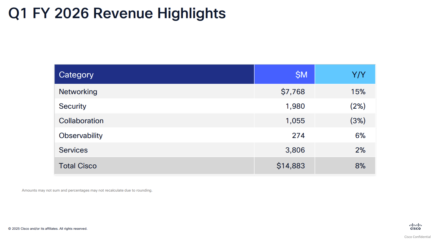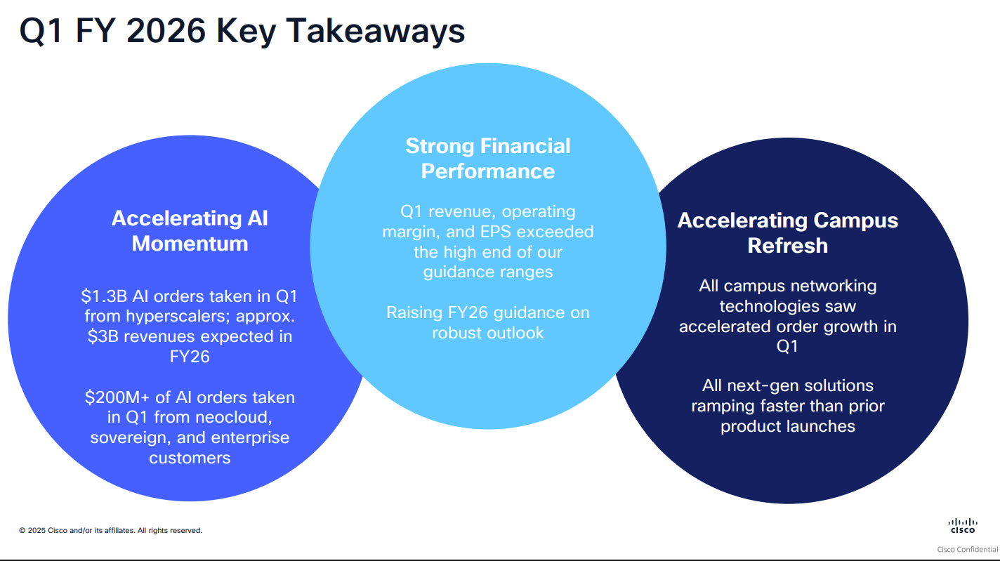 Cisco reported better-than-expected first quarter results, raised its outlook and said it landed more AI infrastructure orders from hyperscalers and posted strong networking growth.
