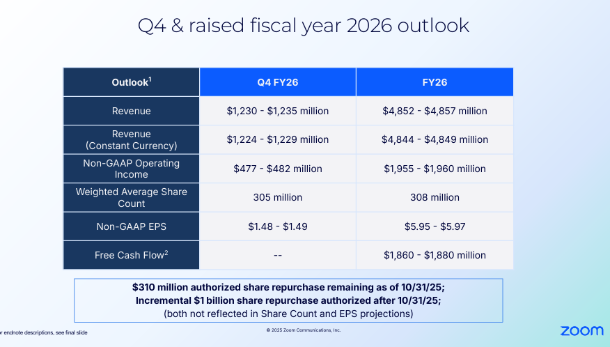 For fiscal 2026, Zoom said revenue will be between $4.852 billion and $4.857 billion with non-GAAP earnings of $5.95 a share and $5.97 a share.