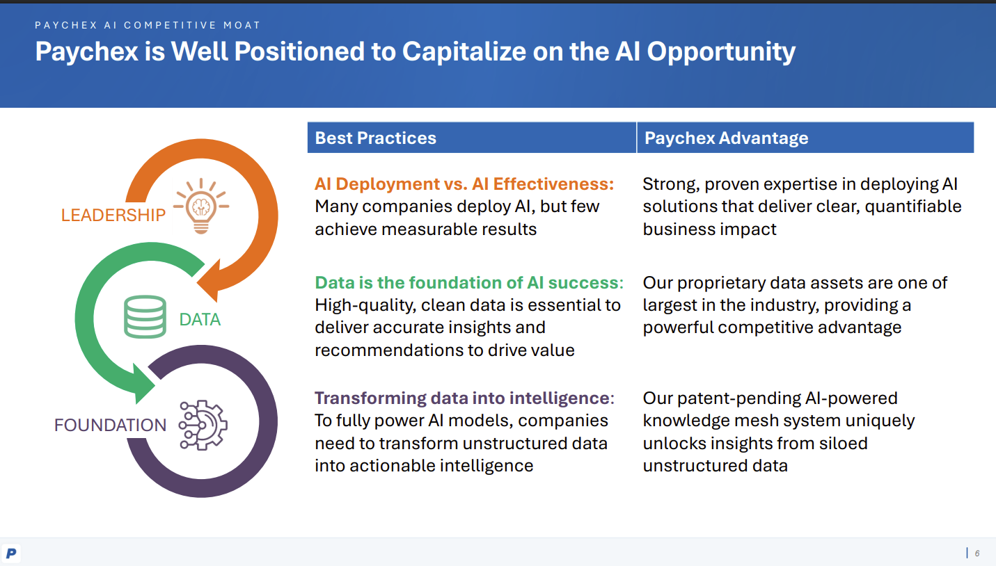 Along with the earnings results, Paychex outlined its AI plans and its positioning. The company recently launched agentic AI tools to automate payroll processing, created a knowledge mesh system that organizes unstructured data such as calls and emails into a searchable network and layered generative AI throughout its platform.