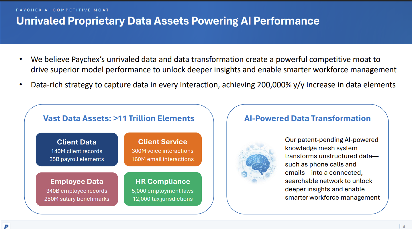 Paychex is betting that its proprietary data sets in human capital management and adjacent markets will make it a winner in AI via productivity and new products.