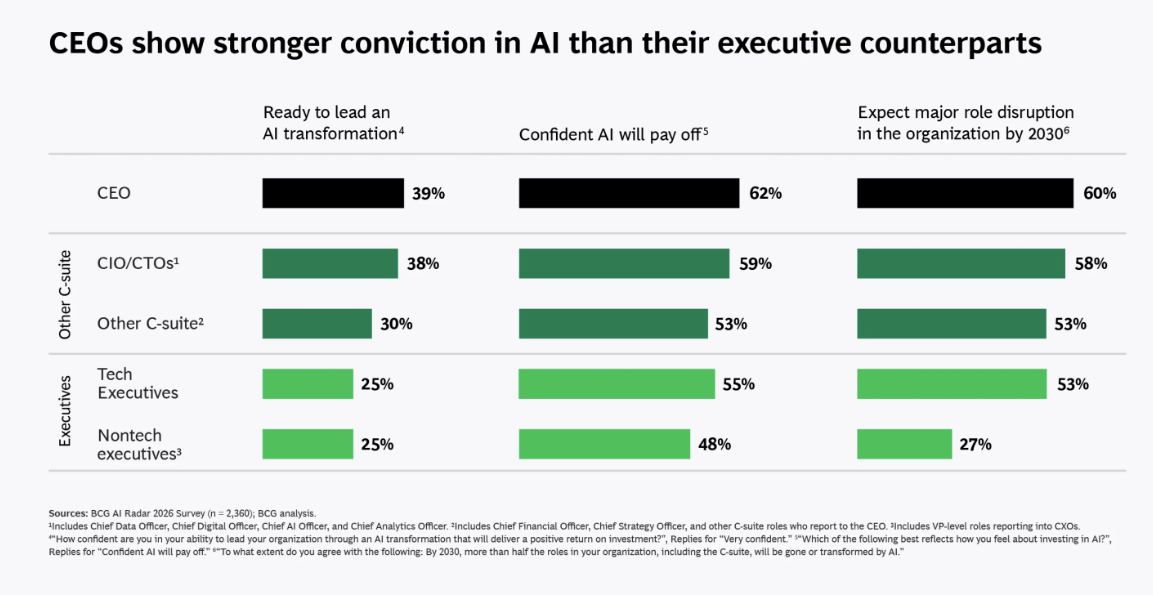- First, CEOs in this BCG report look a bit overconfident. CEOs have stronger conviction on AI than their technology executives.