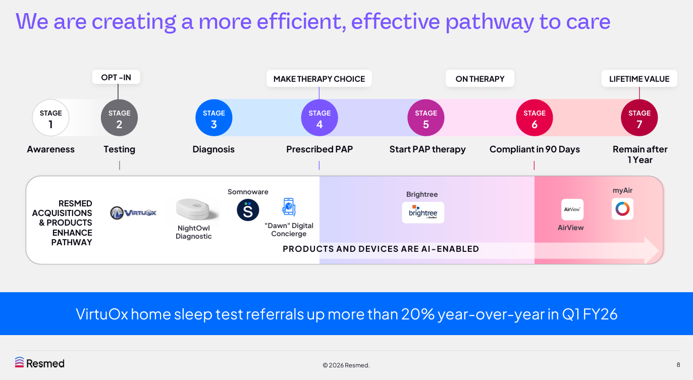 Michael Farrell, CEO of Resmed, said the theme of an AI-driven health concierge is critical for its core value, which sits at the intersection of health and sleep. "We also have a non-FDA-cleared product because it's just a concierge that I call our digital sleep health concierge. It's called Dawn. Not as in a woman, but as in the sun rising over the horizons that you wake up refreshed. And this is a digital sleep health concierge to help you with questions about exercise, drinking water, balancing your day life to have a better sleep life, stopping caffeine after sort of 5 clock, not having alcohol after 8," said Farrell.