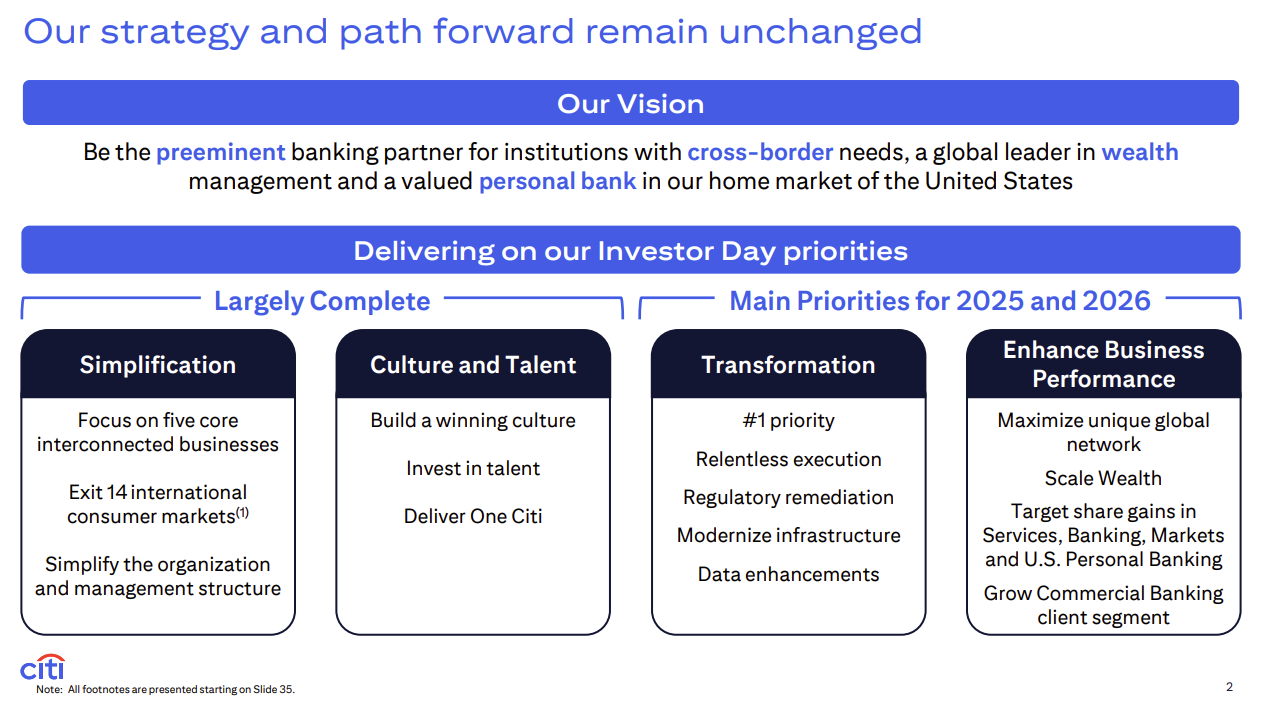 Citigroup is using its productivity gains and technology returns to self-fund investments in transformation, AI and technology.