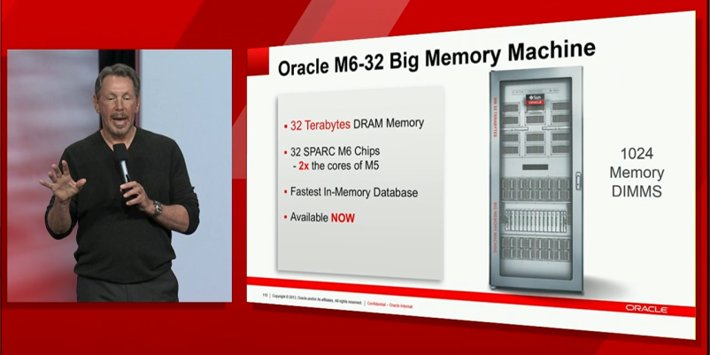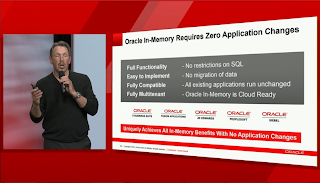 But the real news was Ellison presenting the new in memory option for the Oracle database. Interesting enough the presentation was void of version numbers and Oracle did also not post a press release about the new capabilities - which raises some questions on why that did not happen. More to come during the week - or a desire to keep things general for revenue recognition purposes - we will learn later.