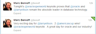 As an observer it's interesting to see how much both industry veterans - Ellison and Plattner - care about solving a performance problem that traditional databases could not address - the flexible crunching of large amounts of data - often referred to as the analytical applications buzzword wise today. And both gentlemen get a tad professorial talking about this - Plattner with blackboard sessions - Ellison with talking about the fundamental challenges of database architecture. And both are passionate about the topic and Ellison was evidently in best spirits - winning two races at the America's Cup certainly helped, too.