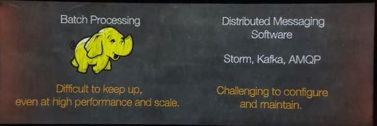 Next he went in a smart way through the deficiencies of the current technology at hand with Hadoop, Storm, Kafka, AMPQ et al - that all work - but are hard to maintain at scale and tough to configure.
