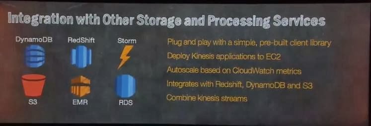 Streams into Kinesis can be scaled and so can backend Kinesis applications. What is most important is, that AWS plays more and more on the synergistic platform field with building and integrating new offerings like Kinesis into the overall AWS platform. So Kinesis can leverage DynamoDB, RedShift, Storm, S3, EMR and RDS - and Kinesis Apps can be deployed to EC2, Autoscale is enabled and Kinesis streams can even be combined.