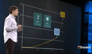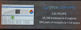 Equally compute needs to be part of the cost optimization component - and there Vogels stresses how important the spot market is. Customers that are shrewdly taking advantage of the spot market are hungama for transcoding, Pinterest that manages front end operation and was able to reduce cost by 75% and finally vimeo, where the company differs between free and paid accounts. And vimeo free accounts are transposed in the spot market, and paid accounts are transposed in dedicated instances. And the final example was Cycle Computing - which can use all of AWS compute capacity - and they procured 1.21 PFlops with over 16k instances and 264 years of compute to calculate compound formulas.