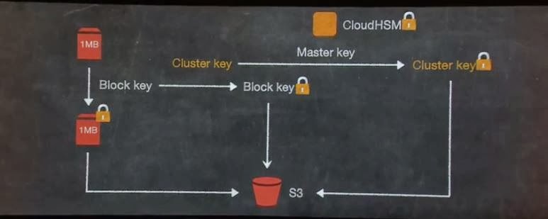 Along these lines Redshift gets encrypted and thanks to a dual key system only the customer and not AWS (or other partners) have access to the encrypted data.