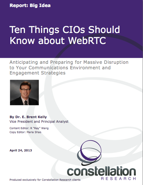 SALT LAKE CITY – April 25, 2013 Constellation Research, Inc. the research and advisory firm focused on disruptive technologies today announced the publication of “Ten Things CIOs Should Know about WebRTC: Anticipating and Preparing for Massive Disruption to Your Communications Environment and Engagement Strategies” by Constellation Vice President and Principal Analyst, Dr. E. Brent Kelly. This research report analyzes the strengths, weaknesses, and potential impact of WebRTC. This report is designed to arm CIOs with the research necessary to help them understand the potential positive and negative impacts of WebRTC on their organizations.