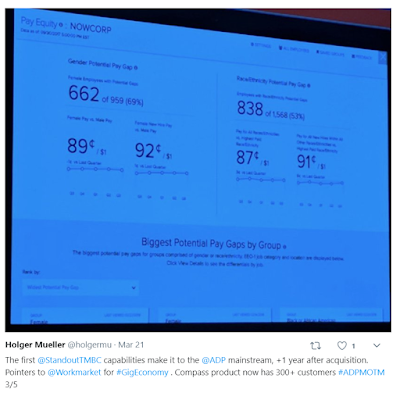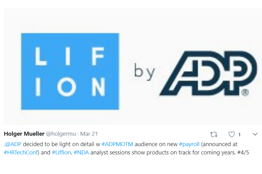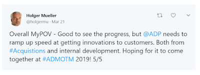 On the concern side, ADP is moving at a conservative, maybe too slow speed. One year is enough time for most vendors to create integrated value from an acquisition like TMBC. And ADP announced its new payroll product, Pi, back at the HR Tech conference in fall - so an update to the MOTM attendees would have been timely. Not to mention ADP's new HR core system Lifion, that ADP advertises for talent publicly, but choose to mention in Orlando. It's always good for enterprises software vendors to be conservative and quality focused, and ADP customers certainly expect that, but vendors can't be too slow rolling out differentiating capabilities either.
