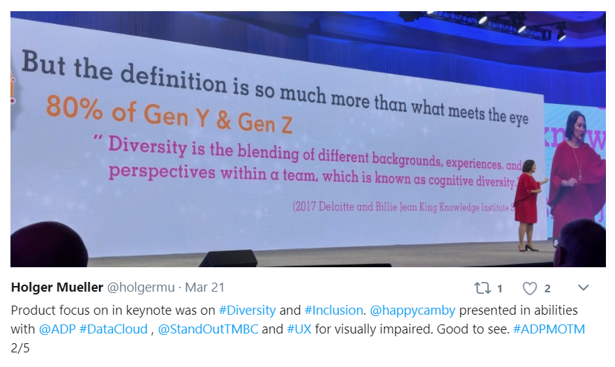 A good event for ADP customers and prospects. ADP keeps delivering on a steady pace and creates value for its customer base. The focus on diversity and inclusion is high on people leader's agenda, so it is no surprise that ADP also focuses on this important topic. Good to see also the first TMBC assets making it to the mainstream North American customer base that ADP is targeting with its Meeting of the Minds conference.On the concern side, ADP is moving at a conservative, maybe too slow speed. One year is enough time for most vendors to create integrated value from an acquisition like TMBC. And ADP announced its new payroll product, Pi, back at the HR Tech conference in fall - so an update to the MOTM attendees would have been timely. Not to mention ADP's new HR core system Lifion, that ADP advertises for talent publicly, but choose to mention in Orlando. It's always good for enterprises software vendors to be conservative and quality focused, and ADP customers certainly expect that, but vendors can't be too slow rolling out differentiating capabilities either.