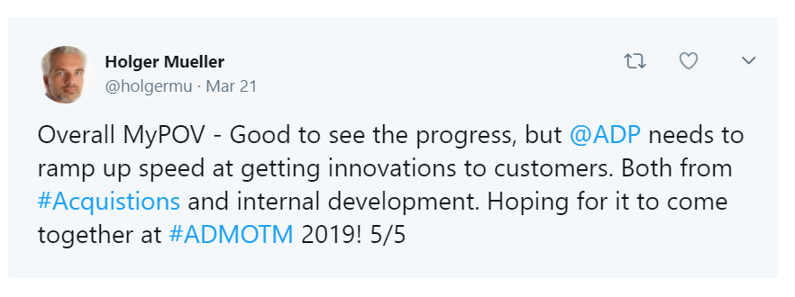 Overall a good event, customers and ecosystem are happy with the progress. A lot of new innovation should see the light at ADP MOTM 2019, fingers crossed. Stay tuned.