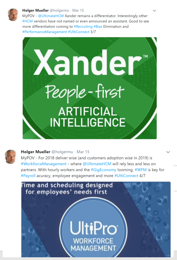 But overall good to see the progress by Ultimate delivering on promises and pushing the AI yardstick further. It remains interesting that no major HCM player except fot Ultimate has named its assistant (yet) and it's unlikely the key HCM players will match or expand the scope that Ultimate offers today and announced for 2018 with Xander. A good position for Ultimate customers. Stay tuned.