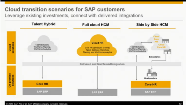 Progress on transition scenarios – SAP did a good job running the audience through the three transition scenarios from on premise to cloud based offerings. SAP offers to run talent in the cloud or a full cloud based HCM offering. And then there is the (I guess originally inspired by byDesign) side by side scenario of running cloud HCM in subsidiaries and staying on premise at headquarters. The latter scenario is where we see customers looking for complimentary cloud based solutions – if they do not have them already. But now SAP has an offering for this scenario.