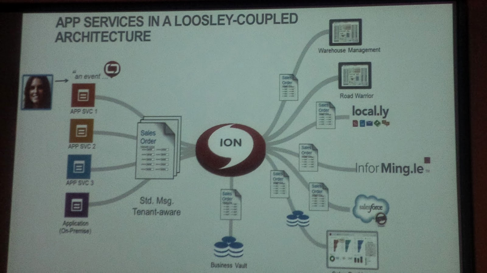 - At the heart of Infor’s technology stack is ION, which was introduced the other year and started out as a file broker (maybe a not giving it enough credit) that allows Infor and 3rd party applications to declare and transfer data feeds in a XML format. Infor was shrewd to not position ION as more – but now it is becoming more, gaining the capability to also invoke APIs on the data it transports. Worth to mention that these APIs will be able to be invoked both locally and remotely. And this makes a lot of sense for Infor, given the expected hybrid deployment scenario of their customers. But it also means that Infor no longer has to replicate functionality, but can start putting functionality into one place and maintain it in one place only, too. This next release of ION is supposed to ship summer this year. And with that ION becomes more than ever the key integration technology for Infor customers.
