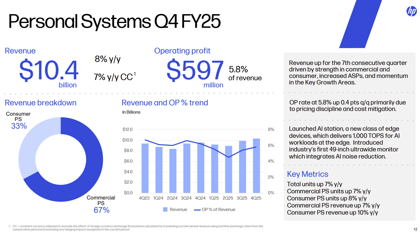 Now HP is moving PCs. Revenue in the fourth quarter for the PC unit was up 8% from a year ago largely due to commercial and premium consumer devices.