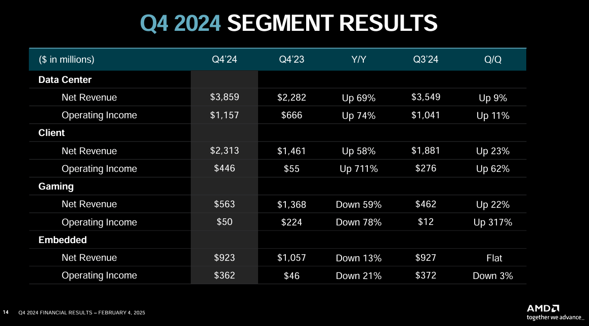 AMD CEO Lisa Su said 2024 was transformative and the data center business is strong. "Data Center segment annual revenue nearly doubled as EPYC processor adoption accelerated and we delivered more than $5 billion of AMD Instinct accelerator revenue. Looking into 2025, we see clear opportunities for continued growth," said Su.