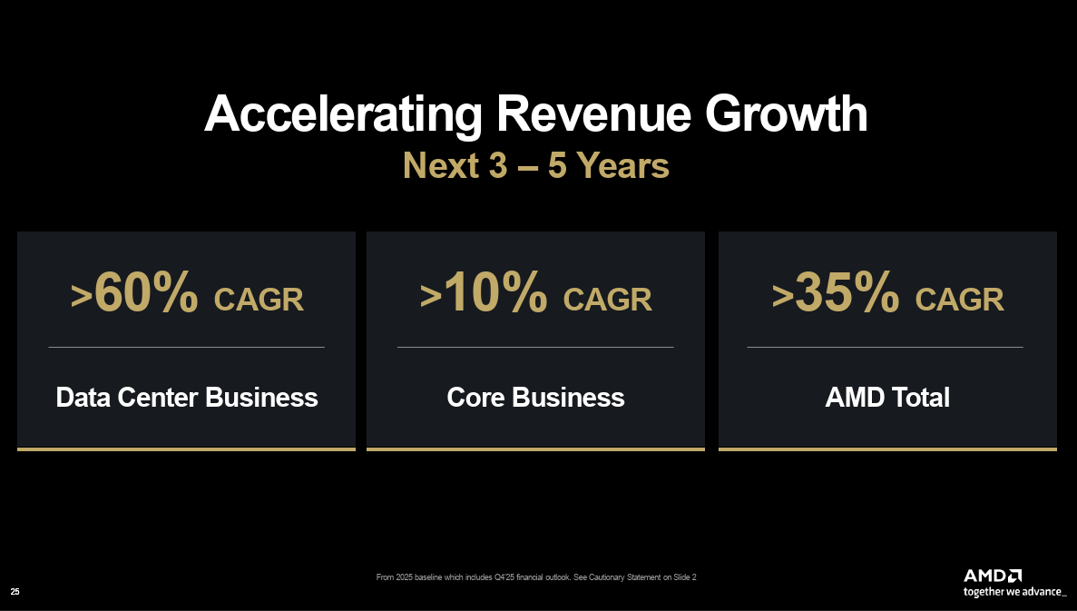 - AMD's data center business will grow at a 60% compound annual growth (CAGR) rate with 10% for its PC and gaming and embedded units.