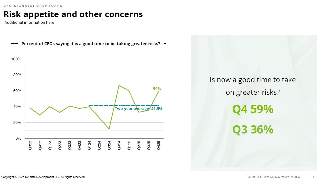 With that optimism surging among CFOs, it's not surprising that those execs want to take more risks. According to Deloitte, 59% of CFOs think it's a good time to take on greater risk, up from 36% in the third quarter.