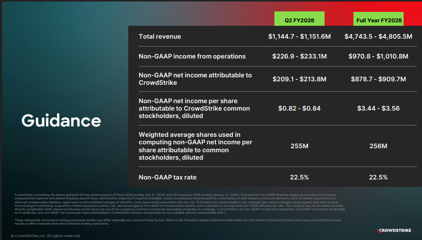 As for the outlook, CrowdStrike projected second quarter revenue of $1.14 billion to $1.512 billion. Wall Street was looking for $1.16 billion in revenue for the second quarter. Non-GAAP earnings for the second quarter will be 82 cents a share to 84 cents a share. For fiscal 2026, CrowdStrike projected $4.74 billion to $4.8 billion with non-GAAP earnings of $3.44 a share to $3.56 a share.