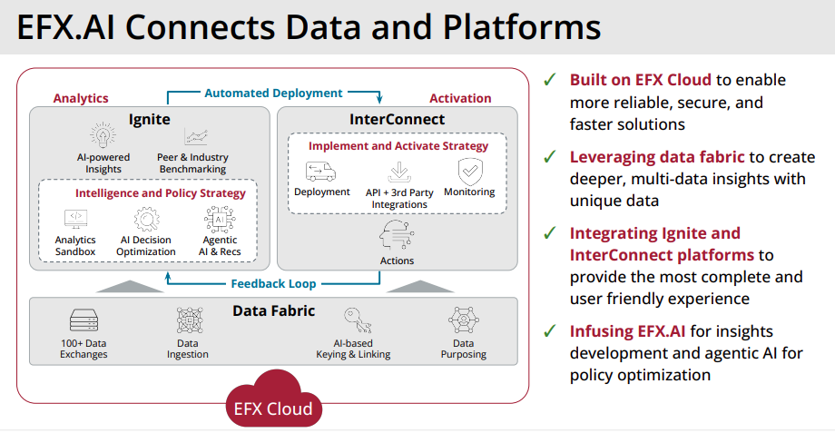 CEO Mark Begor said at a recent investment conference: "The power of the AI allows us to ingest more data and we have more data than our competitors. We believe we can deliver products that are differentiated versus our competitors because I think everyone in the room knows when you use more data in this decision, you generally get a higher predictive solution. And higher predictability means ROI from our customers and it means either market share or price for Equifax."