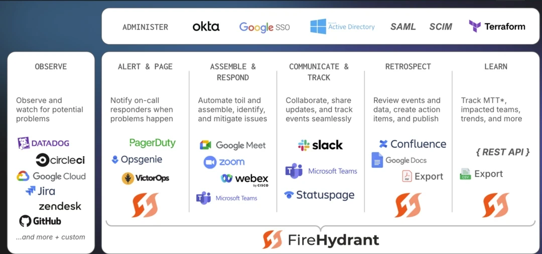 - Fast responses using FireHydrant's AI to summarize incident context and playbooks to deal with them.