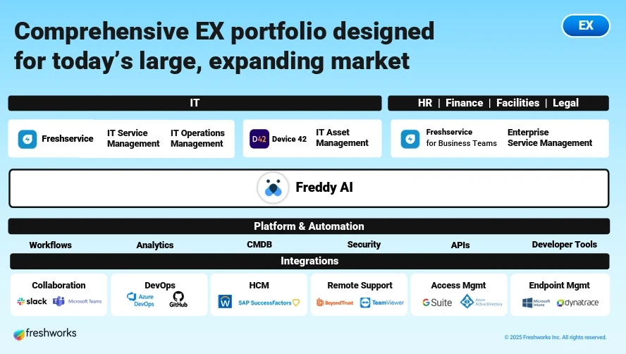 Freshworks will launch a standalone version of FreshService for Business Teams, which won't require the broader platform. The standalone enterprise service management product, aimed at legal, HR, finance and facilities, currently has an annual run rate of $35 million, double from a year ago.