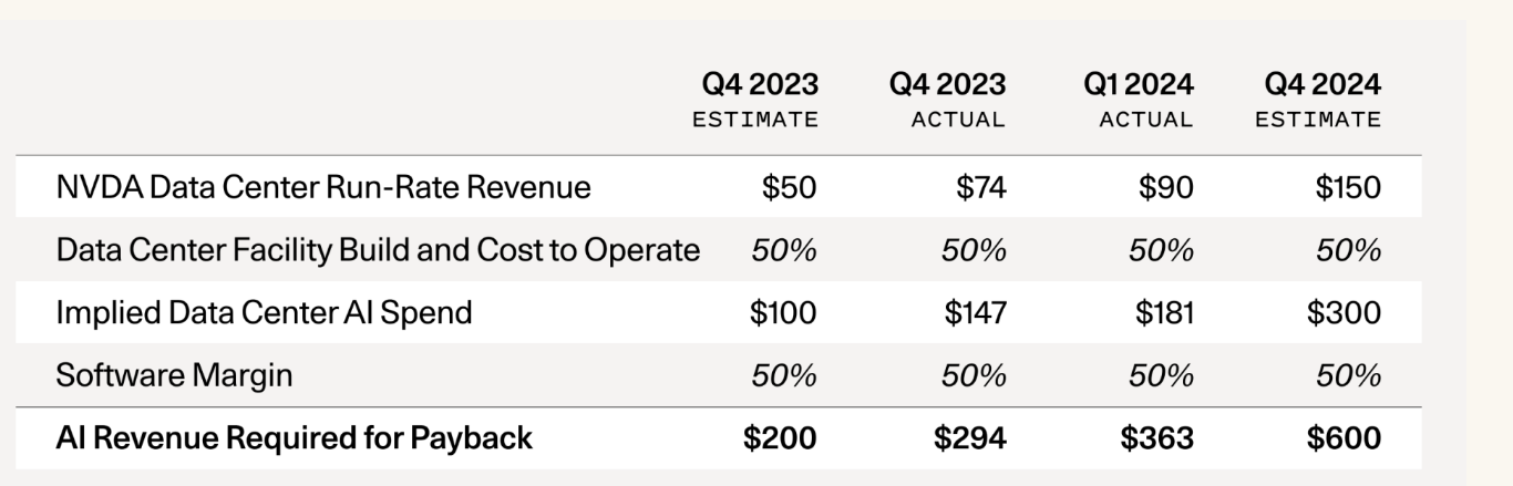 In June, venture capital firm Sequoia chimed in on the AI buildout. Sequoia partner David Cahn noted the big gap between revenue expectations implied by the AI infrastructure buildout and actual revenue growth, which Cahn used as proxy for end user value.