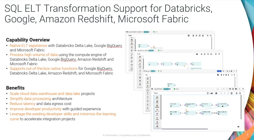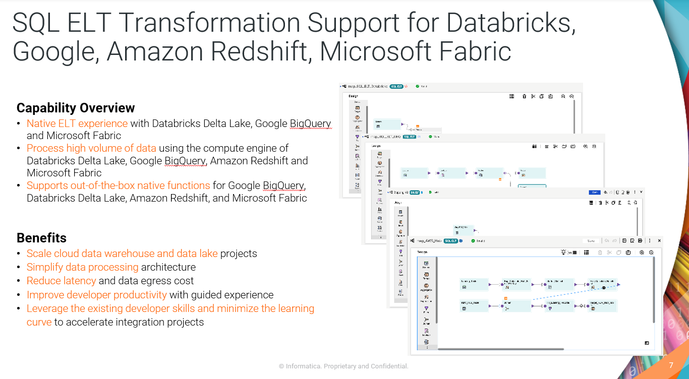 - Informatica launched SQL Extract Load Transform support for Databricks, Google BigQuery, Amazon Redshift and Microsoft Fabric. Informatica is adding the capability to transform data pipeline flows into SQL ELT to streamline data processing.