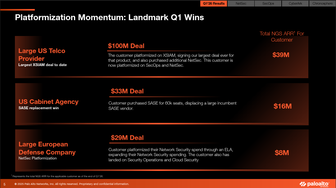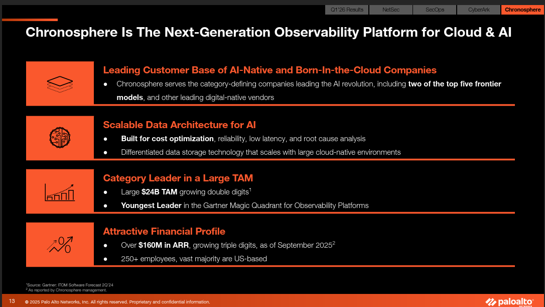 CEO Nikesh Arora said the first quarter was marked by "significant platformization wins." Palo Alto has been beefing up via acquisitions with Chronosphere as well as CyberArk. Chronosphere has annual recurring revenue of $160 million as of Sept. 30.