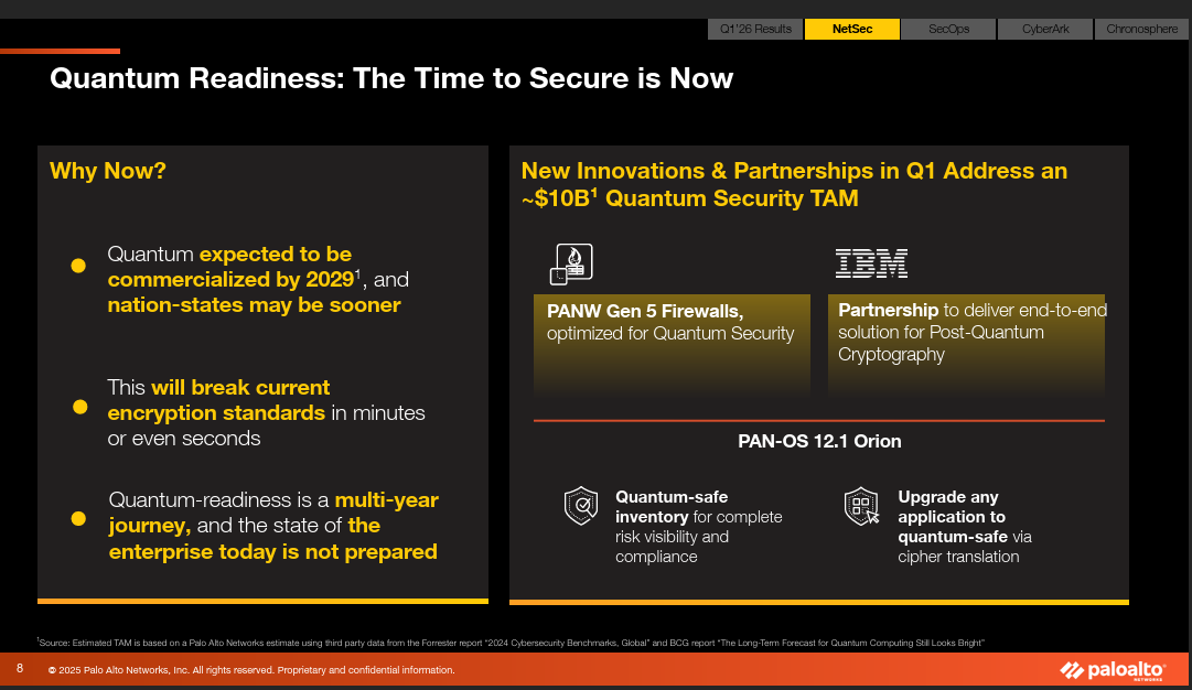 Ahead of the earnings, Palo Alto Networks and IBM said they will launch a joint offering focused on quantum-safe security. The companies will combine IBM's Quantum Safe Transformation services with the network-level, cryptographic intelligence from Palo Alto Network's platform.