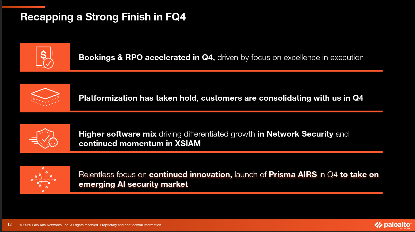 CEO Nikesh Arora said the company executed well in the fourth quarter and looking for platforms that "are designed to work in concert." Arora said remaining performance obligation (RPO) is accelerating into the new fiscal year and signaling growth.