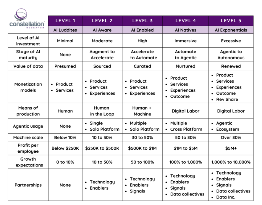 Constellation Research CEO Ray Wang outlined an AI maturity model that ranges from AI Luddites to AI Exponentials.