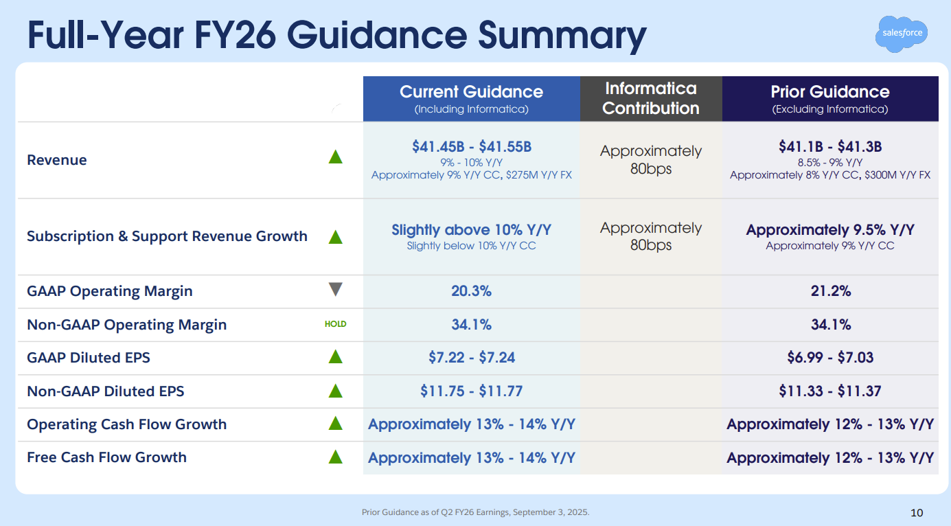 Salesforce said fiscal 2026 revenue will be $41.45 billion to $41.55 billion with non-GAAP earnings of $11.75 a share to $11.77 a share.