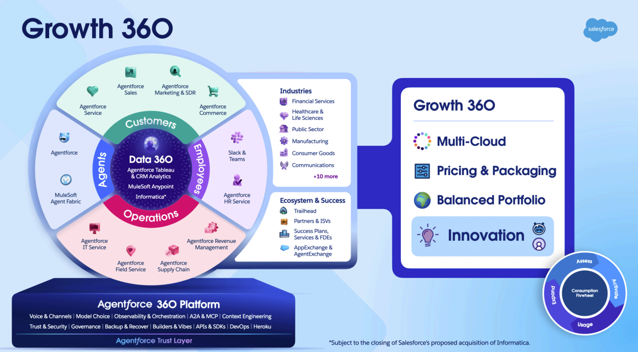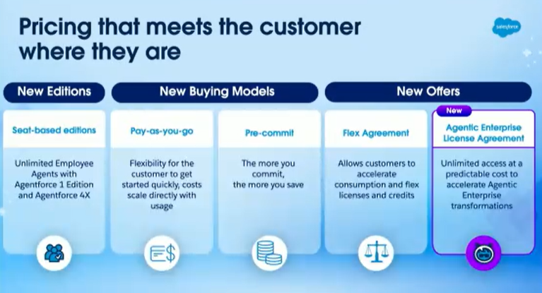 - Agentic Enterprise License Agreements (ELAs): flat-fee, unlimited use of Data 360 and Agentforce for predictable costs — already a dozen signed and more than 150 accounts in negotiation.
