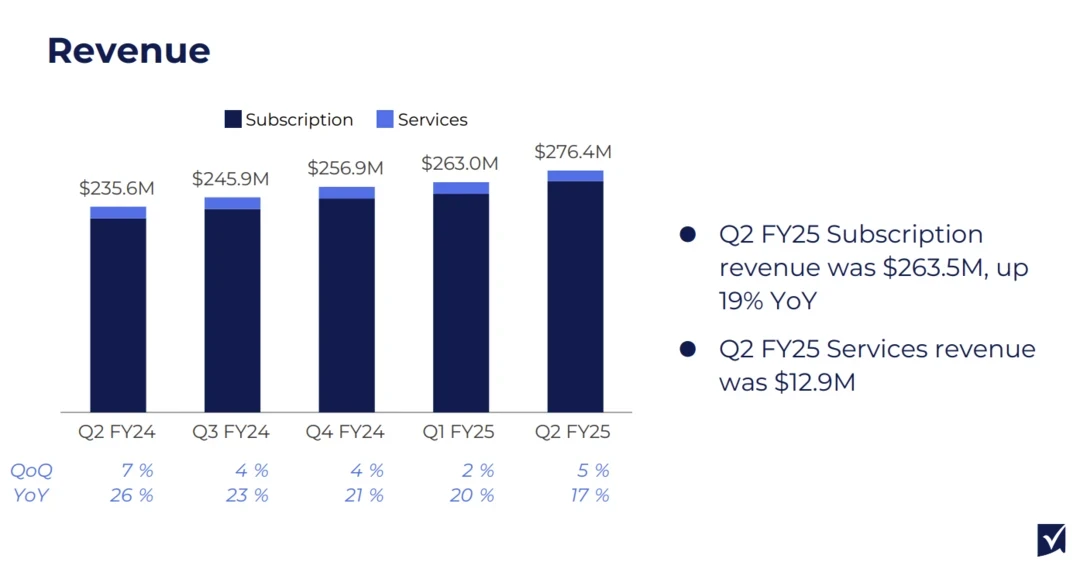 For the second quarter, Smartsheet reported revenue of $276.4 million, up 17% from a year ago. Annual recurring revenue was $1.09 billion. Smartsheet reported earnings of $7.9 million, or 6 cents a share.