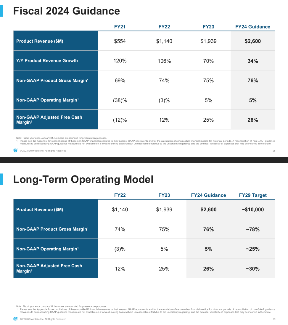 As for the outlook, Snowflake projected product revenue growth of 28% to 29% for the third quarter, or about $670 million to $675 million. For fiscal 2024, Snowflake is projecting product revenue of $2.6 billion, up 34% from a year ago.