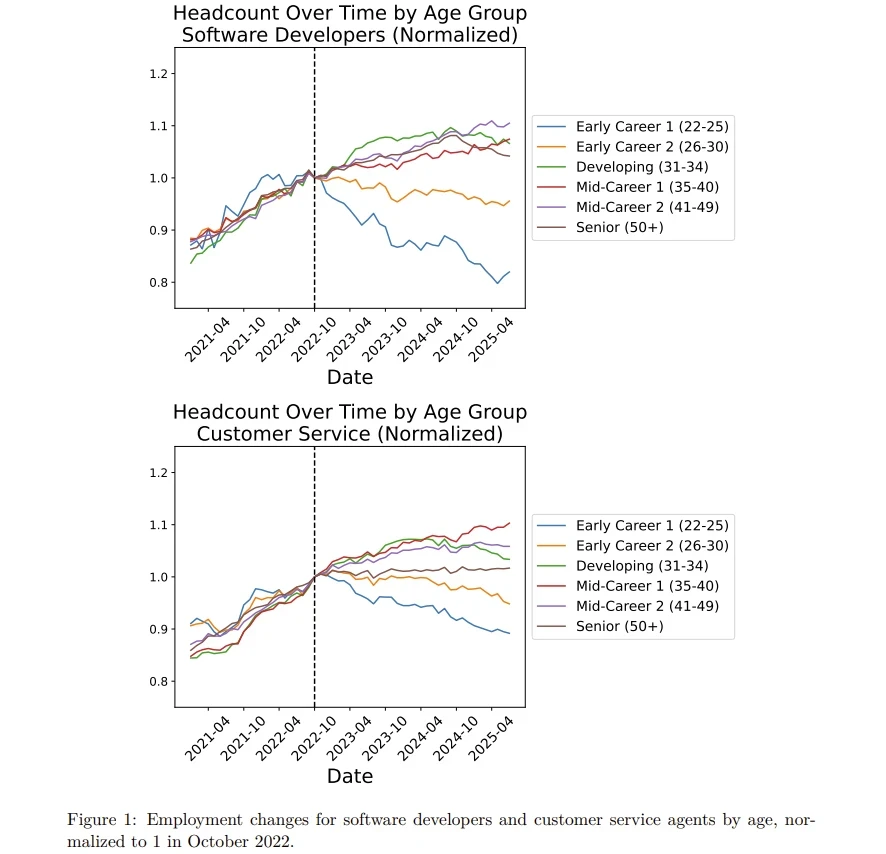- Employment for young workers has declined in AI-exposed occupations. By July 2025, employment for software developers aged 22 to 25 declined by nearly 20% from its peak in 2022.