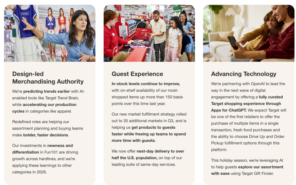 Michael Fiddelke, Target Chief Operating Officer, will become CEO and he spent much of the company's third quarter earnings call talking about experience improvements. "We need to offer a more consistently elevated experience across our stores and digital platforms," he said. "And we need to more fully use technology to improve our speed, guest experience and efficiency throughout the business."