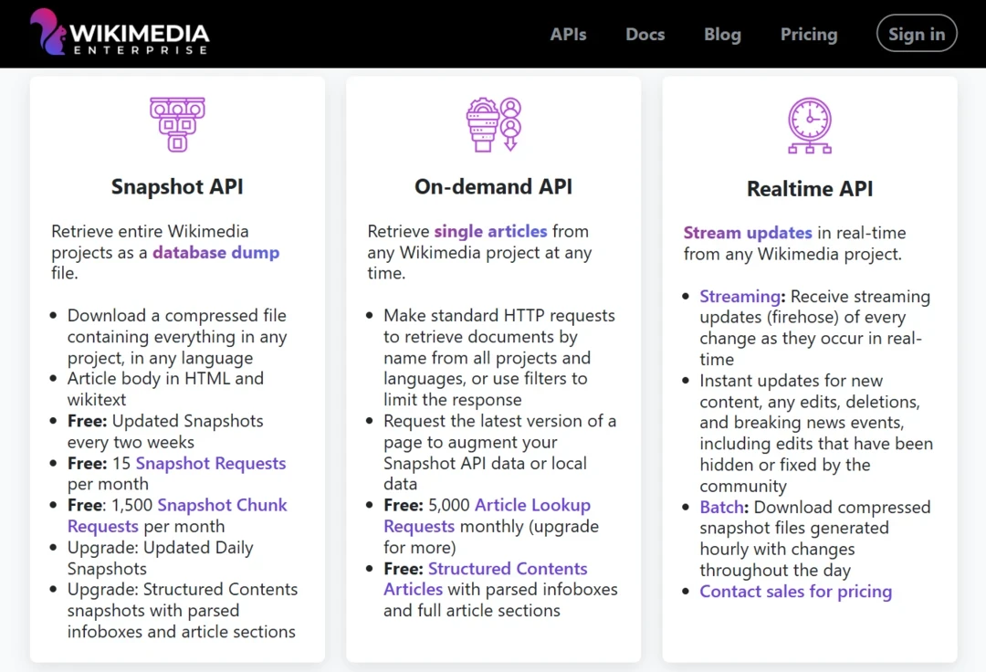 The additional customers of Wikimedia Enterprise highlight the importance of Wikipedia for training large language models. Wikimedia Enterprise provides the datasets of Wikipedia and its sister projects as well as enterprise APIs that include snapshots, on-demand pulls and streaming updates.