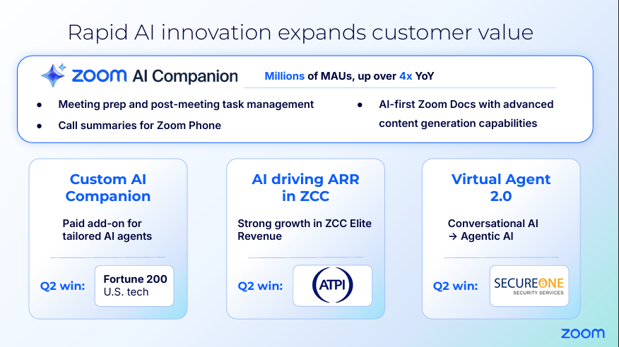 Zoom Communications reported strong second quarter results and CEO Eric Yuan said the company is seeing customers broaden their AI usage.