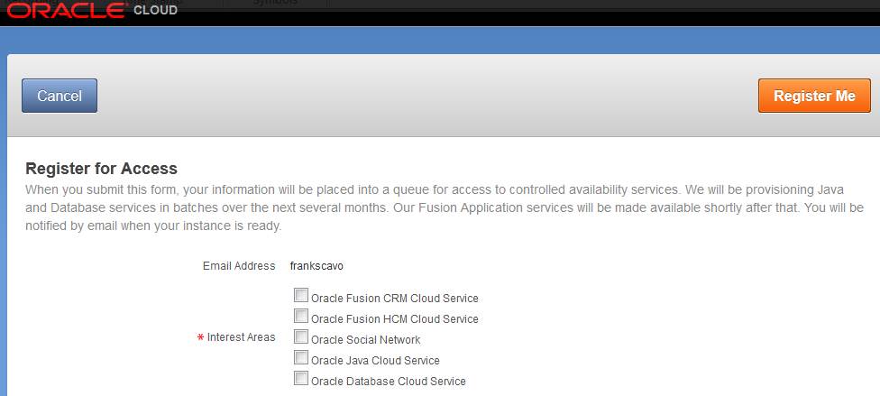 When you submit this form, your information will be placed into a queue for access to controlled availability services. We will be provisioning Java and Database services in batches over the next several months. Our Fusion Application services will be made available shortly after that. You will be notified by email when your instance is ready.