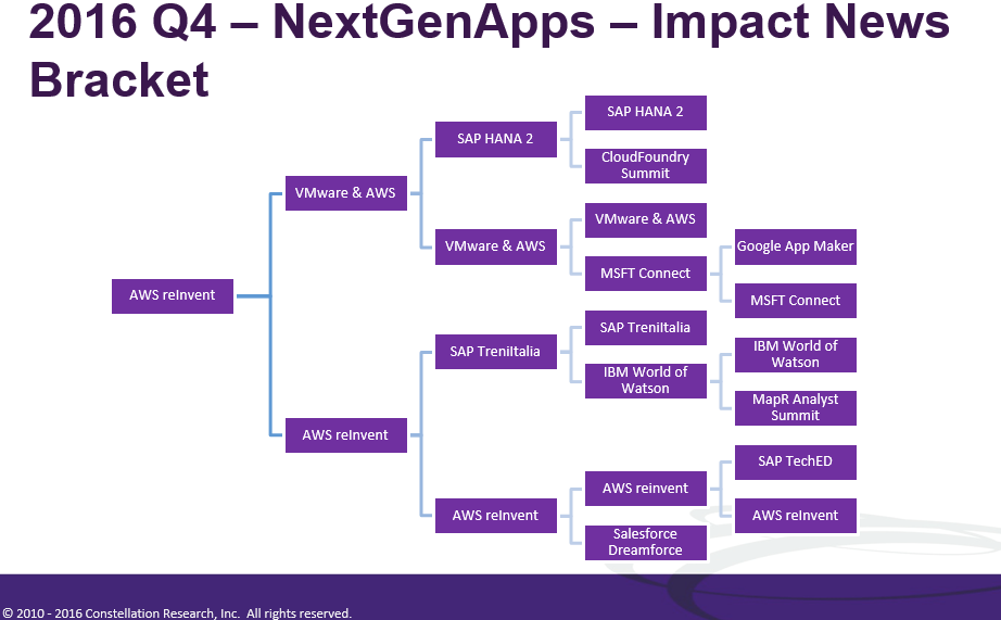 - SAP TechEd Barcelona - A very good event for SAP customers with key HANA (HANA 2) and HANA Cloud Platform announcements. Necessary after the low profile of the Las Vegas edition (read here). Unfortunately paired against the probably most impactful news of the quarter, AWS reInvent (read here).
