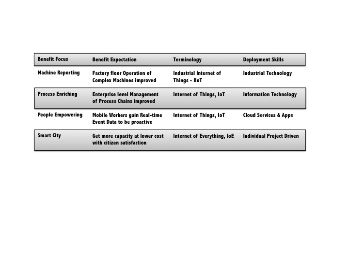 This blog is different, it moves to examining the three principle focuses, or uses, for the Internet of Things, IoT, and Industrial Internet of Things, IIoT, that will provide most enterprises with a clear starting point as to what choices to make to align a deployment with their Business needs. For the sale of completeness the fourth focus that relates to Smart Cities is also included.