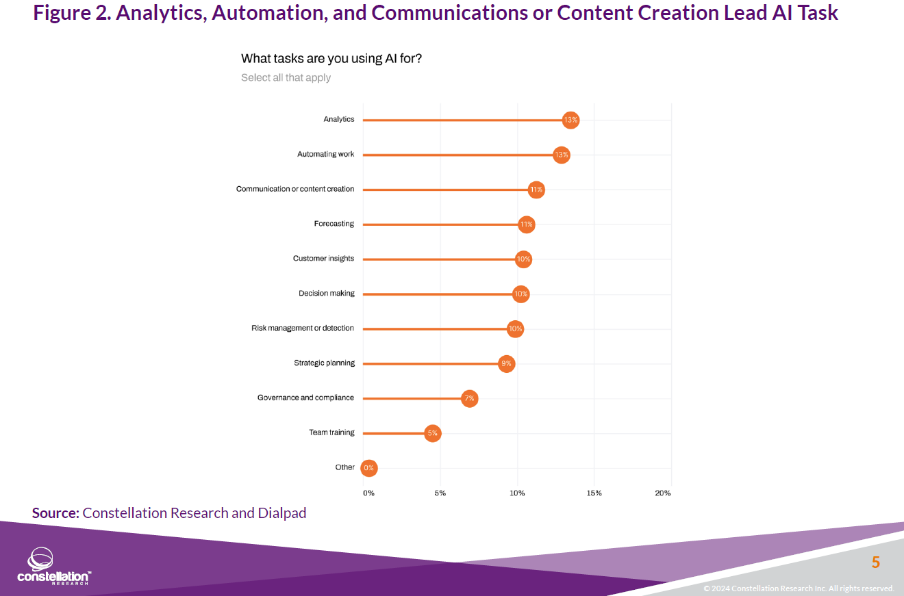 - 33% of executives say their companies are using two AI solutions, 15% have three and 9.5% using four or more.