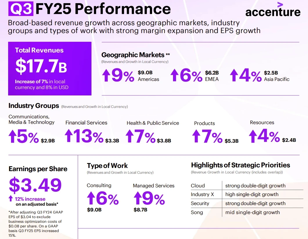 As for the outlook, Accenture said it now expects fiscal 2025 revenue growth of 6% to 7% with earnings of $12.77 a share to $12.89 a share. Fourth quarter revenue will be between $17 billion and $17.6 billion.