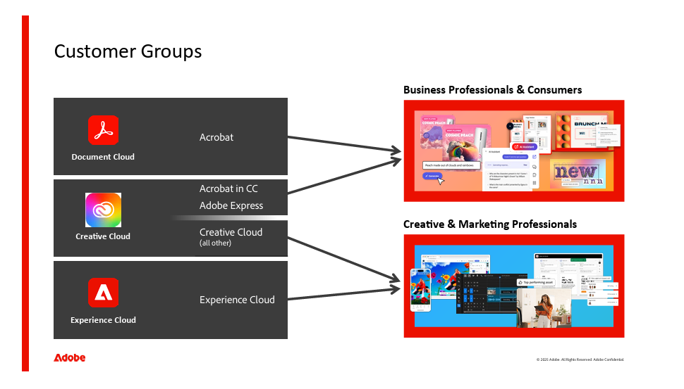 Adobe is also refining how it will report results from its primary audiences--business professionals and consumers and creative and marketing professionals. "We will win by focusing on âBusiness Professionals and Consumersâ and âCreative and Marketing Professionalsâ with a unified product strategy and go-to-market. We will start to provide financial visibility into these two new groups starting this quarter and expand on this at our Investor Day at Summit next week," said Narayen.
